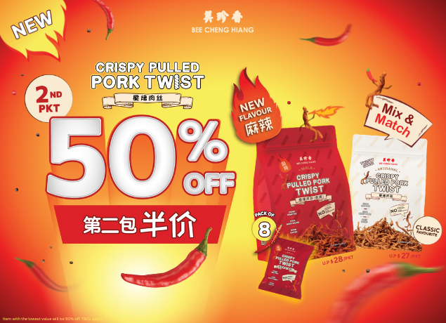 Bee Cheng Hiang is turning up the heat with our Crispy Pulled Pork Twist — now available in Original and Mala flavours!
